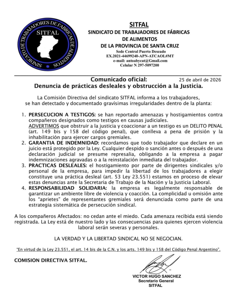 En este marco, la Comisión Directiva del SITFAL emitió un comunicado oficial el 25 de abril de 2026, donde informa la detección y documentación de graves irregularidades dentro de la planta.