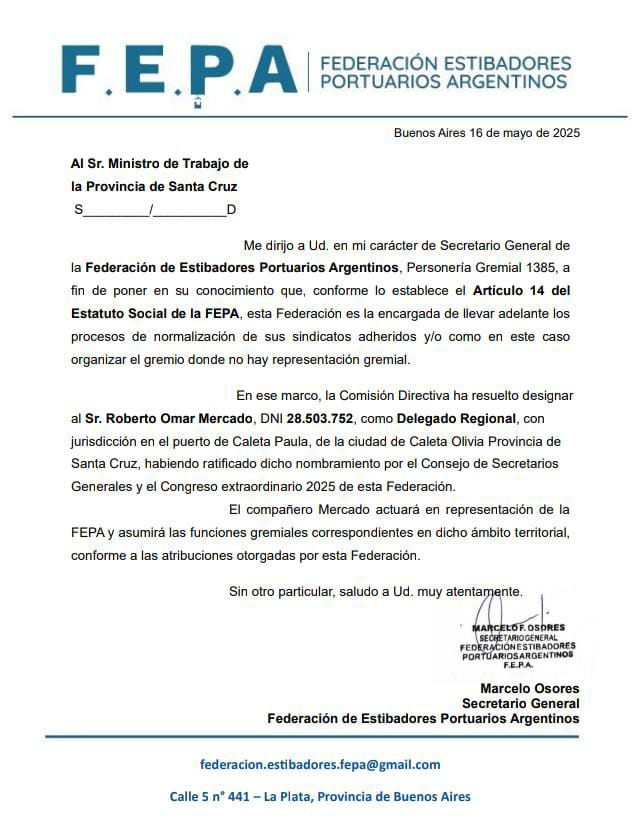 En ella, la federación intenta justificar su intromisión en Caleta Olivia señalando que “organizará el gremio donde no hay representación gremial”, una afirmación falsa y maliciosa. “El último delegado elegido por la voluntad de los trabajadores es Santiago Videla, reconocido por la comunidad portuaria. FEPA no tiene sindicatos adheridos en Caleta Paula y, por tanto, carece absolutamente de competencia para intervenir en este ámbito”, señala el documento de impugnación elevado al propio ministro Ezequiel Verbes.