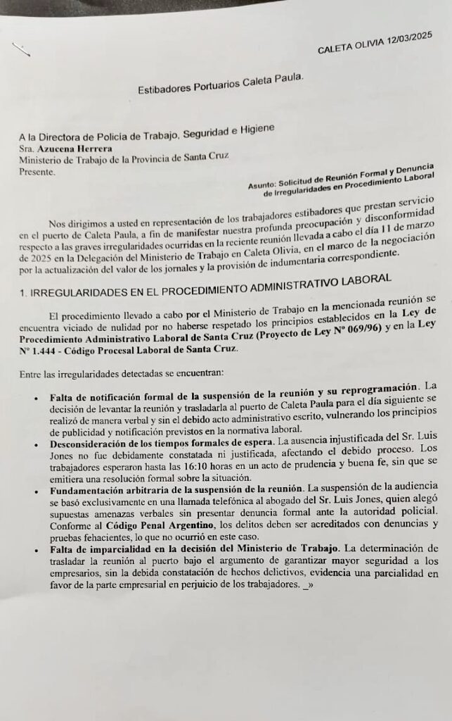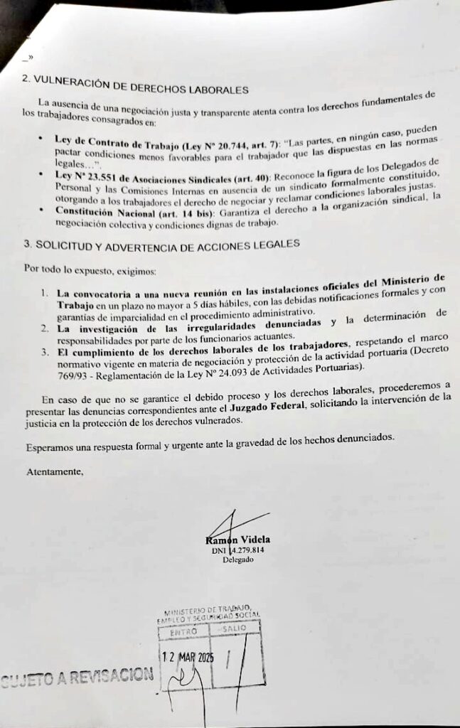 El traslado arbitrario de la reunión al puerto, sin ninguna notificación formal ni fundamento jurídico sólido, deja en evidencia la falta de imparcialidad de la cartera laboral, que, en lugar de garantizar una negociación justa, actúa como una extensión de los intereses empresariales.