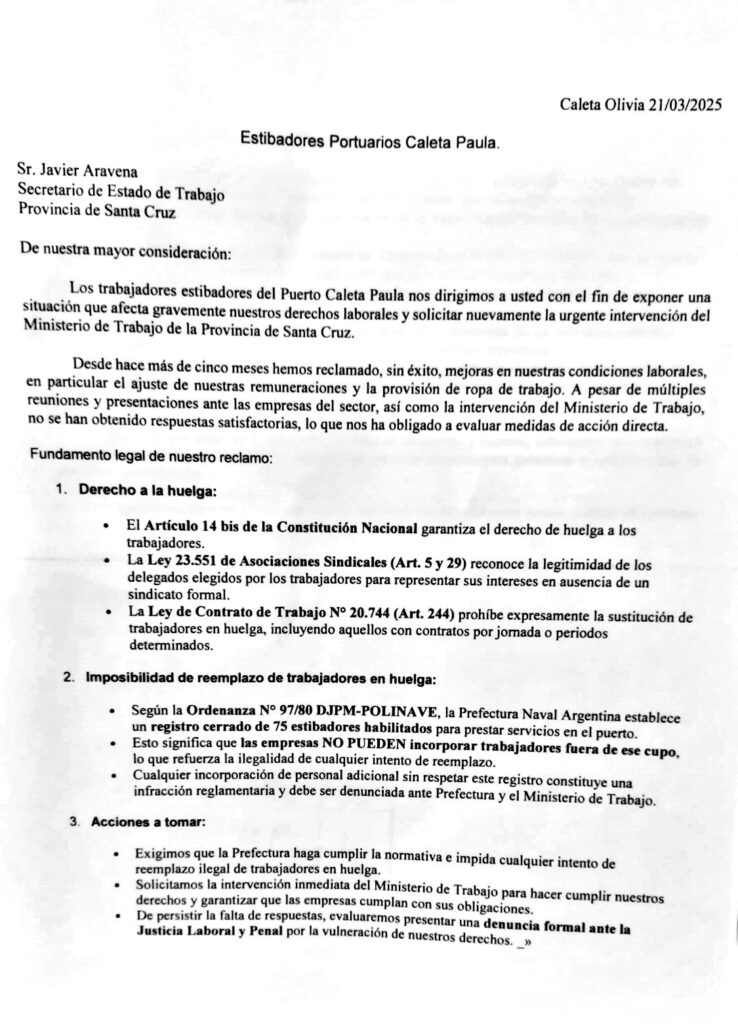 Los trabajadores estibadores de Caleta Paula han sido pacientes y han agotado todas las instancias administrativas para resolver sus demandas de manera pacífica. Sin embargo, el accionar del Ministerio de Trabajo, lejos de buscar soluciones, ha favorecido la precarización y el abuso empresarial.