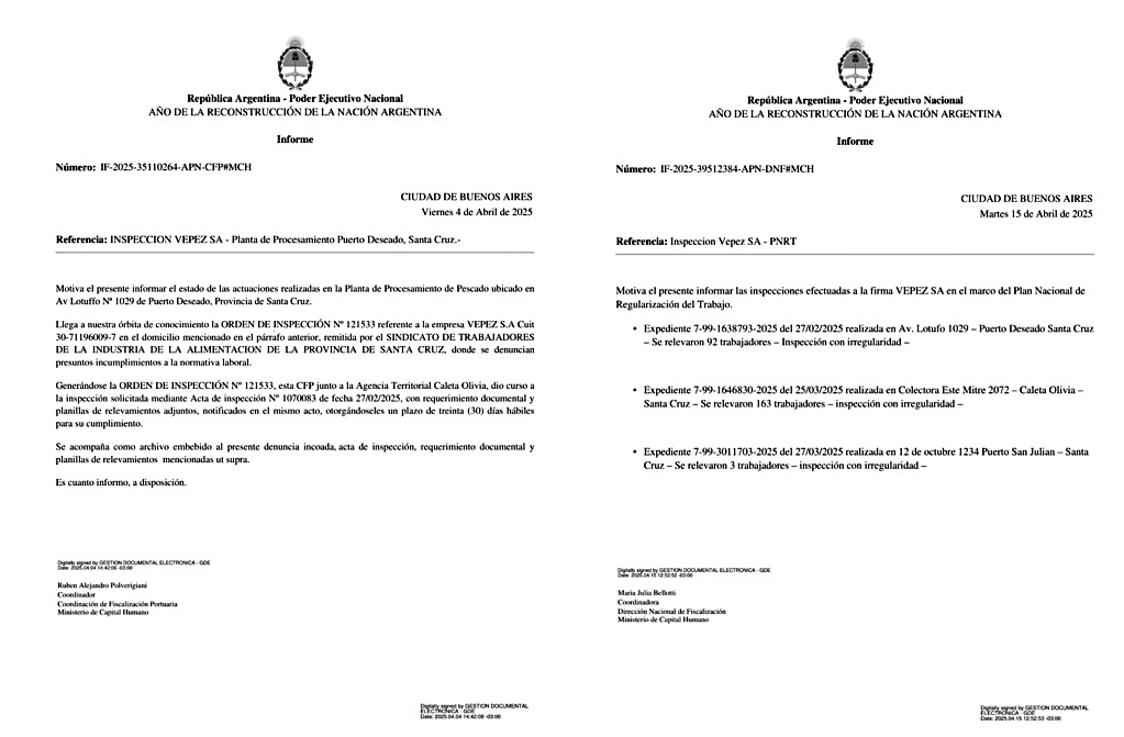 Puerto Deseado – Santa Cruz. En una provincia que se jacta de sus riquezas marítimas, la verdadera cara de la industria pesquera quedó al desnudo: trabajo en negro, tercerización encubierta y funcionarios que miran para otro lado. La empresa VEPEZ S.A., con plantas operativas en Puerto Deseado, Caleta Olivia y Puerto San Julián, fue inspeccionada por el Estado Nacional en el marco del Plan Nacional de Regularización del Trabajo. El resultado: irregularidades laborales en todas sus sedes.